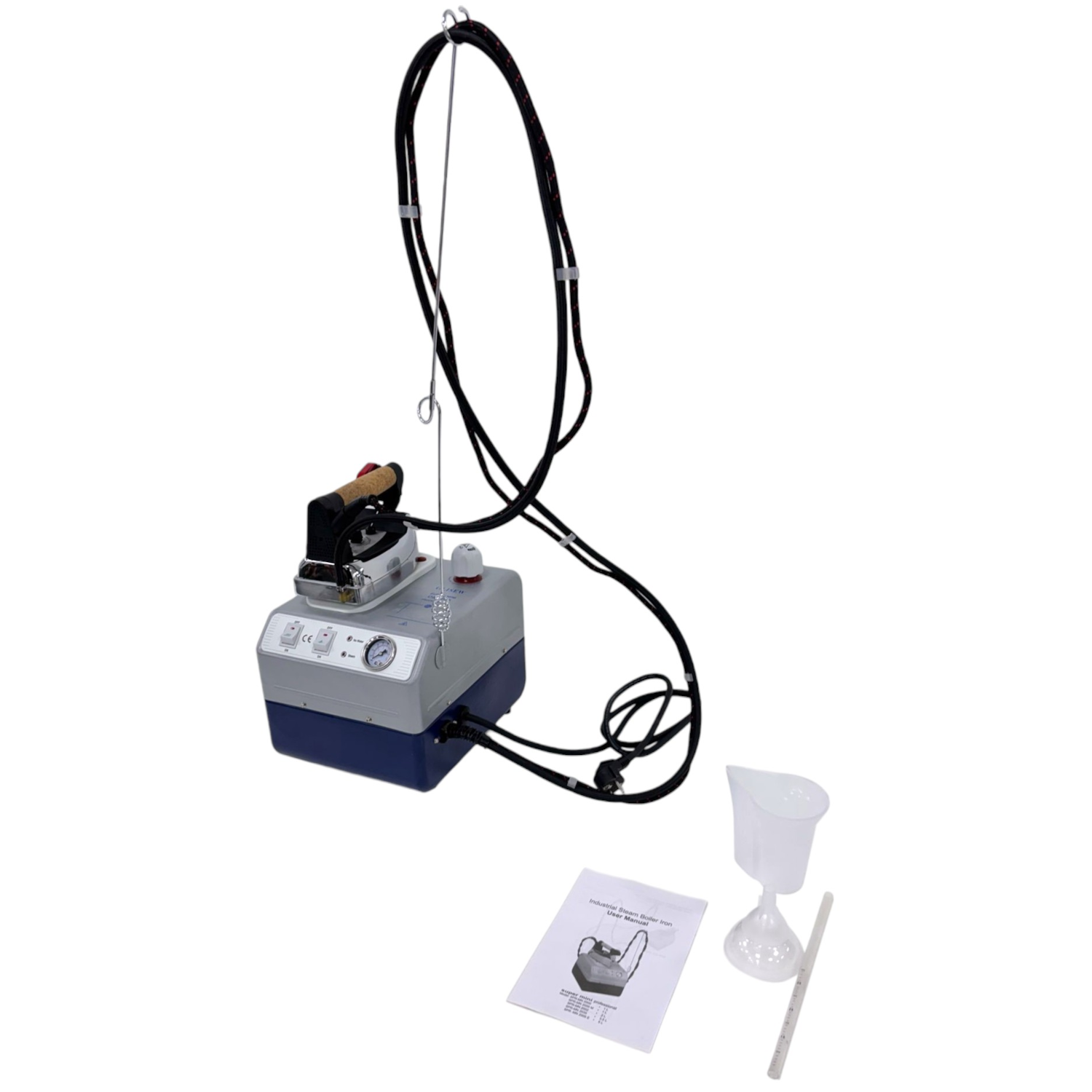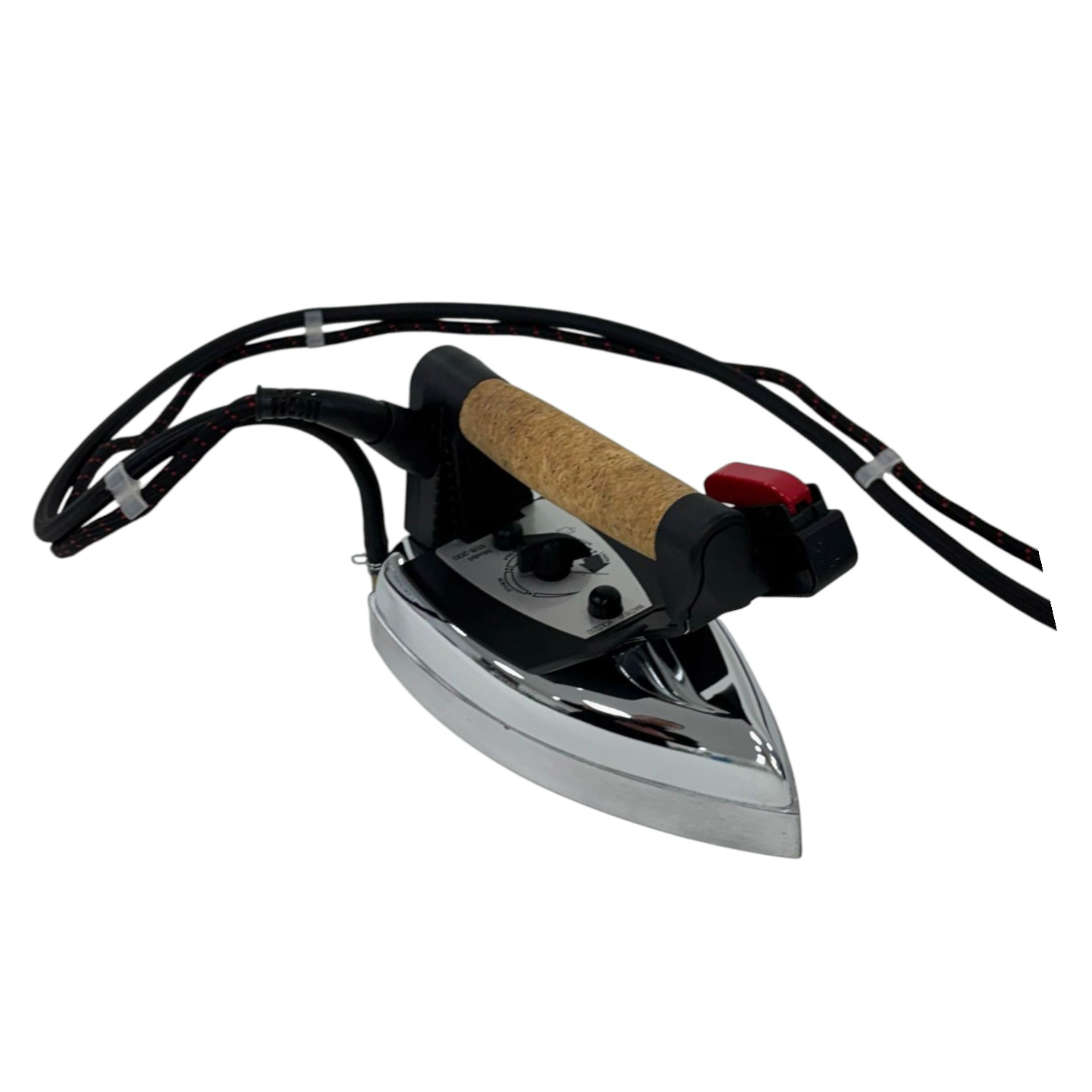 W zestawie znajduje się profesjonalne żelazko, wyposażone w ergonomiczną, korkową rękojeść, która zwiększa komfort użytkowania. Dodatkowym atutem jest możliwość wymiany elementu grzejnego, co wpływa na trwałość i łatwość serwisowania sprzętu.